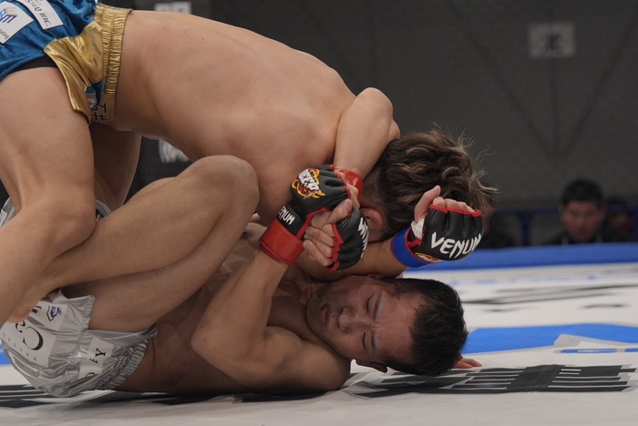 リアネイキドチョーク狙い。さらにトップから肩固めに移行も、そこでトップを奪った石井。クラッチを解いた平井は三井で差してハーフで上体立てるが、剥がして寝かせた平井は下から腕十字も石井も対応。