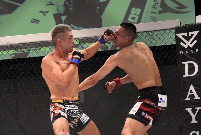 神田の右ローに右。しかし神田はニータップでシングルレッグで崩すとすぐに立つ山田が左右で前に。右ジャブで神田の鼻を赤くさせる。