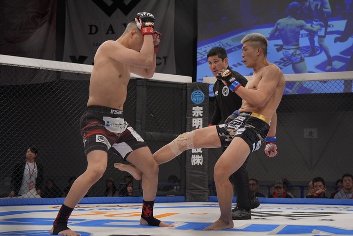 シングルレッグを見せた神田はオーソに。さらに右ローをダブル。オーソの山田は左ジャブ。神田は右ローでバランスを崩す。山田も左ジャブを突くと、右インロー。インローを蹴り返す神田。サウスポー構えで右外足を取ってクリンチ左ヒザ。山田もスイッチしてフック。左ジャブ。右ロー。そこにカウンターの右ジャブを合わせる神田。