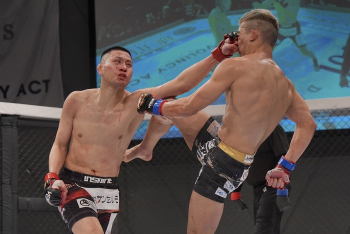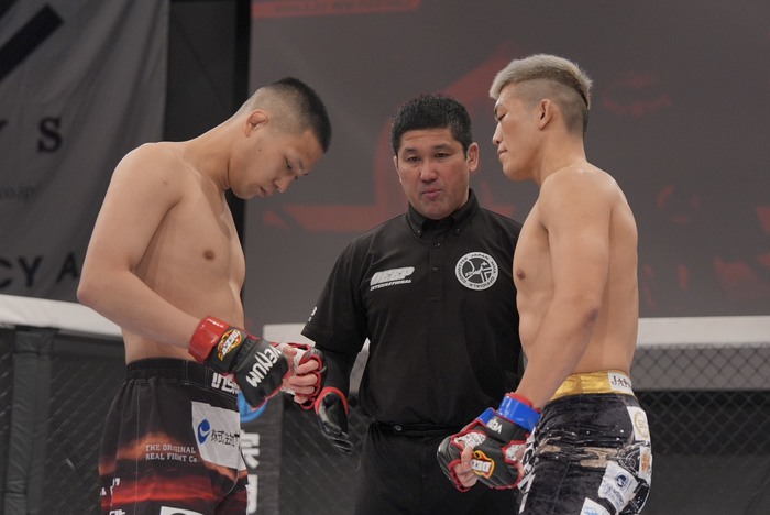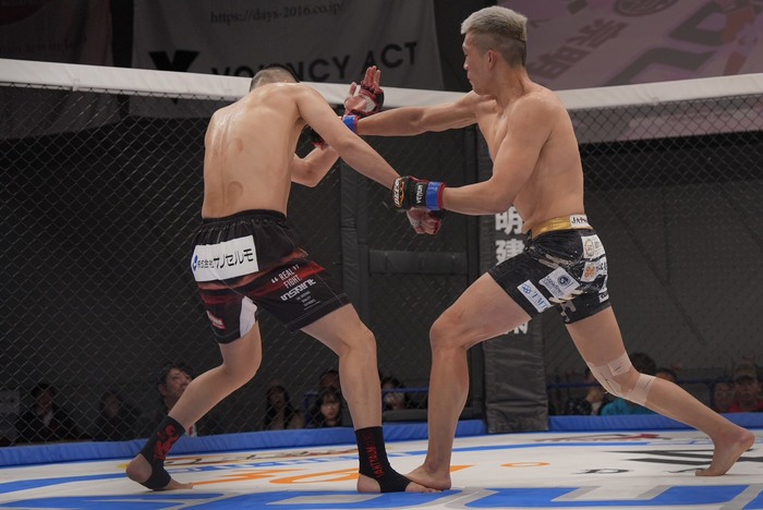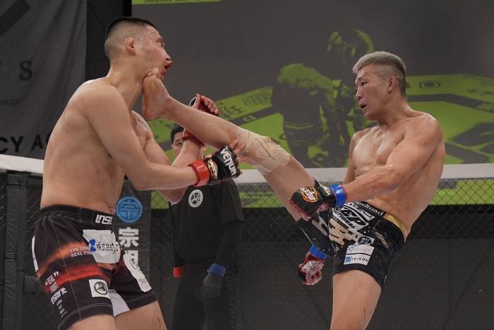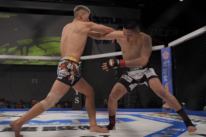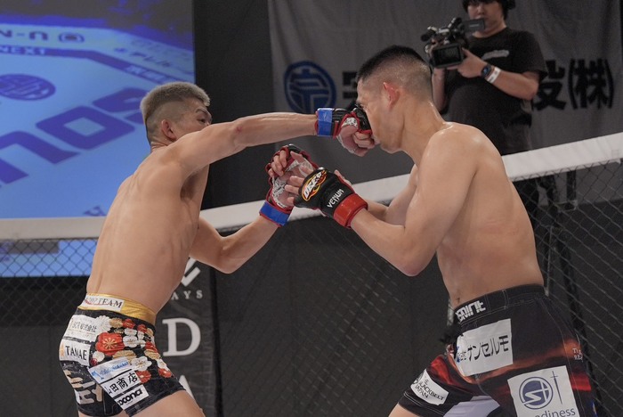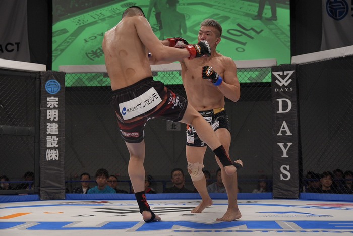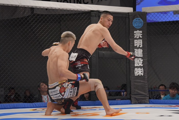 シングルレッグを見せた神田はオーソに。さらに右ローをダブル。オーソの山田は左ジャブ。神田は右ローでバランスを崩す。山田も左ジャブを突くと、右インロー。インローを蹴り返す神田。
