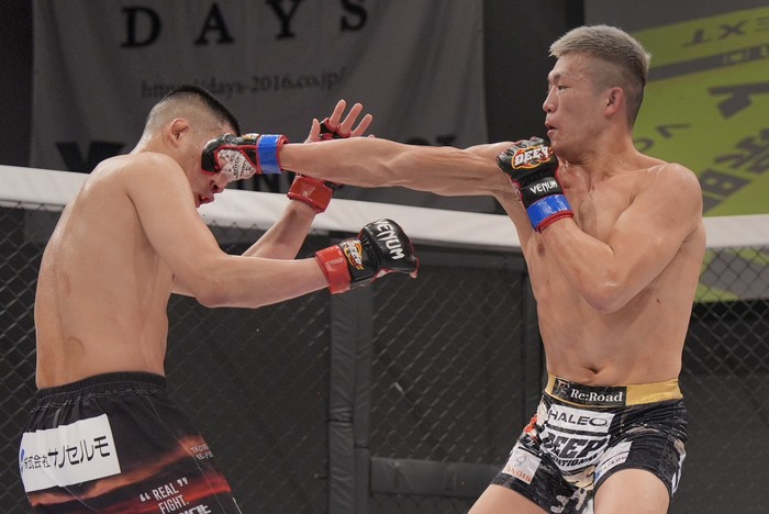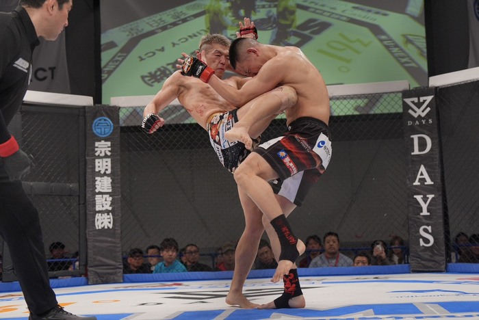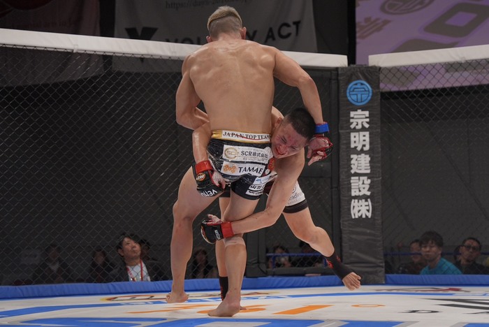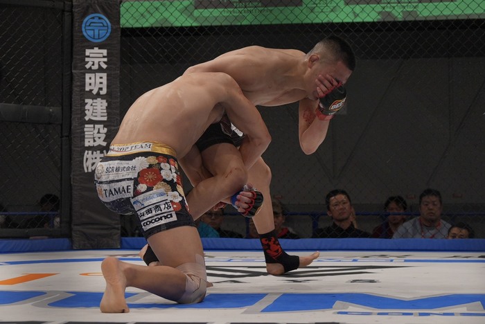 しかし右ボディから左フックを効かせた山田が前に! 回る神田にジャブから右ストレート。右ジャブを返した神田はダブルレッグテイクダウン!