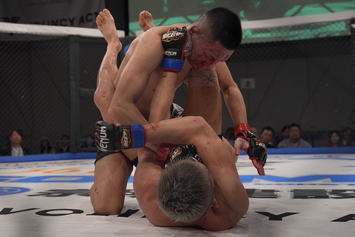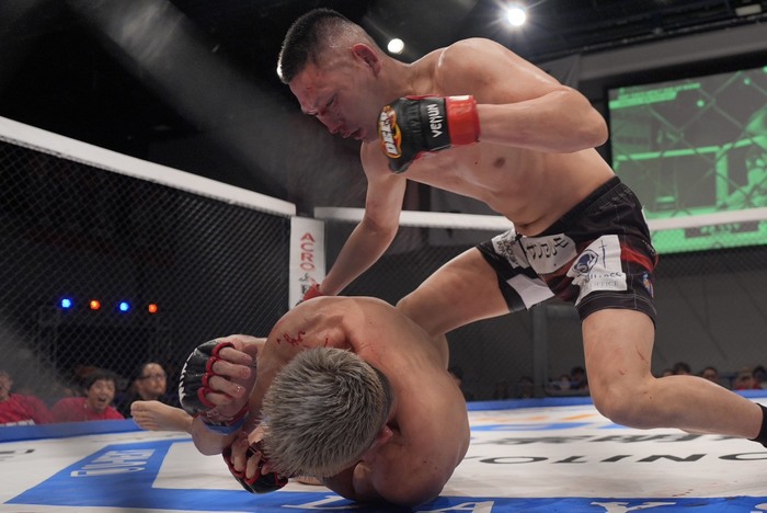 ギロチン狙いの山田から首を抜く神田。しかし山田も蹴り上げを顔に。神田もパウンドで飛び込み。そこで立つ山田。しかし神田はテイクダウン。すぐに立った山田は右を振るが大振りに。