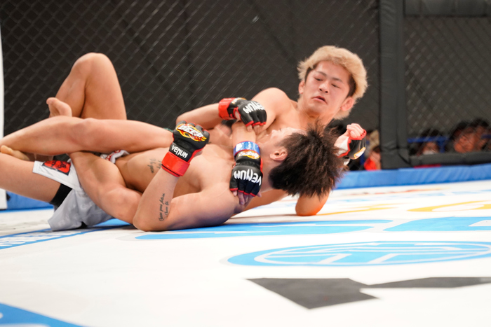 1R、先にテイクダウンの火の鳥にスクランブルからバックを奪う中務。正対狙う火の鳥にオタツイスターから再びバック。鉄槌。