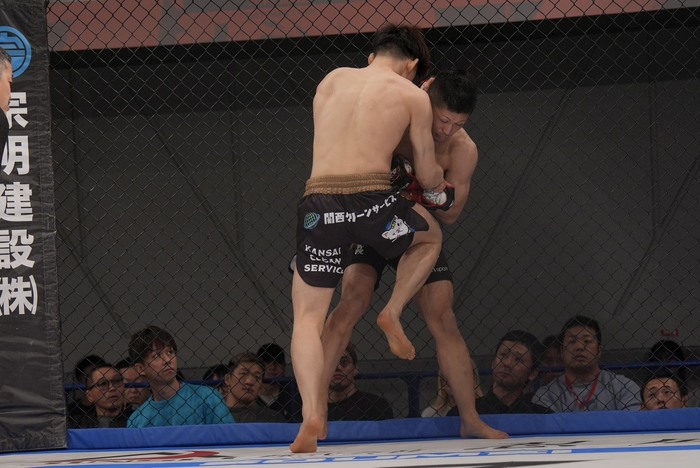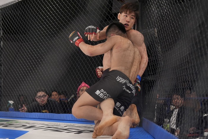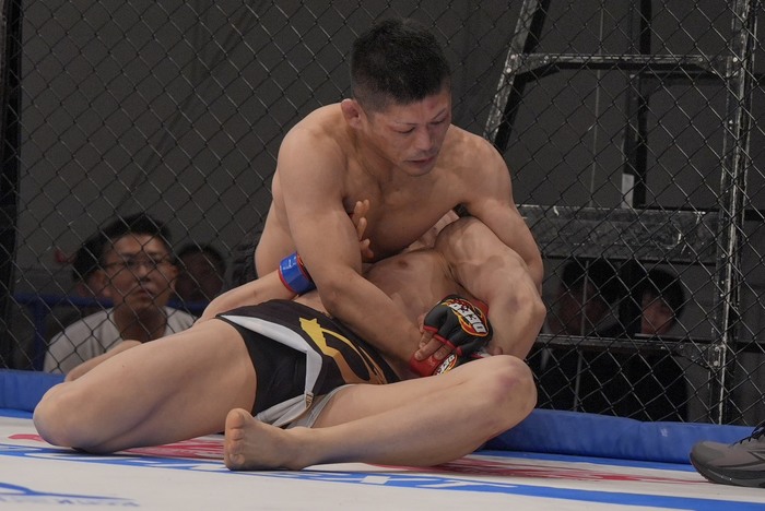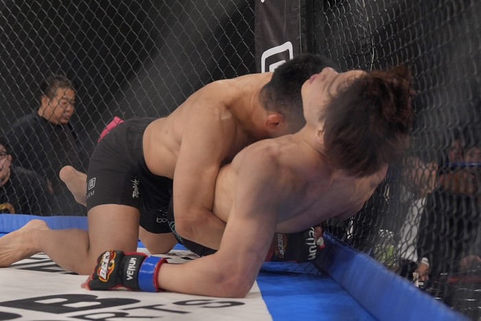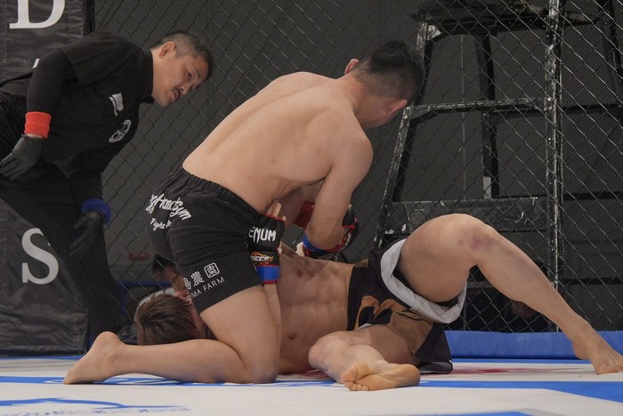 片ヒザ立ちになる黒岡に片足を挟む諏訪部はボディロックテイクダウン。サイドから左足をかけてバックから身体を伸ばしてバックマウントからパウンド。喉下に腕を入れリアネイキドチョークを極めた。