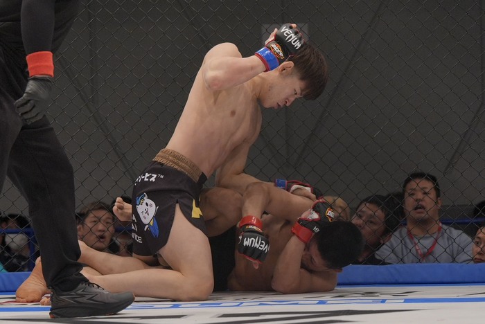 1R、ともにオーソドックス構え。ワンツーの右の黒岡。諏訪部の組みを切ってヒザ。足を手繰る諏訪部を潰して鉄槌。ハーフの諏訪部に右のヒジを連打! さらにパウンド。止められそうなところで動く諏訪部だが、左で押さえつけて右ヒジ連打の黒岡。両足を戻した諏訪部にバックを奪う黒岡はバックマウントからパウンド連打! マウントでパウンド。少しずつ動いて凌ぐ諏訪部。