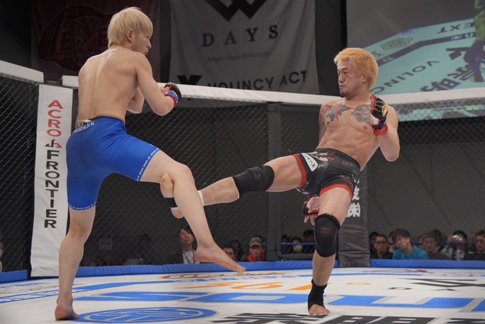 サウスポー構えの吉田に右を当てて前に出る御代川だが、組む吉田が押し込みブレーク。身から左フックに左ミドルの吉田。インローを蹴った御代川。吉田の入りにアームインギロチンチョーク。クローズドに入れて絞めるが、吉田は首を抜いて鉄槌からマウント。背中を見せて立つ御代川は正対してゴング。