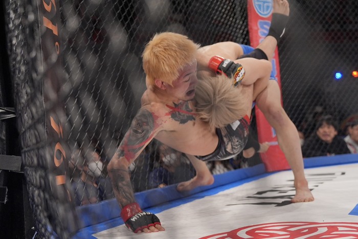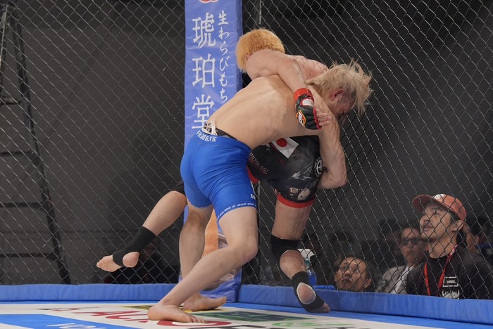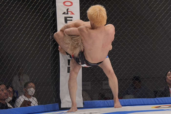 すぐに組んだ吉田のバッククリンチを切って前に出る御代川はインロー、ワンツーで前に。右を突くがそこにダブルレッグの吉田。ケージで凌ぐ御代川は頭を落としてヒザ。頭をがぶりヒザ。