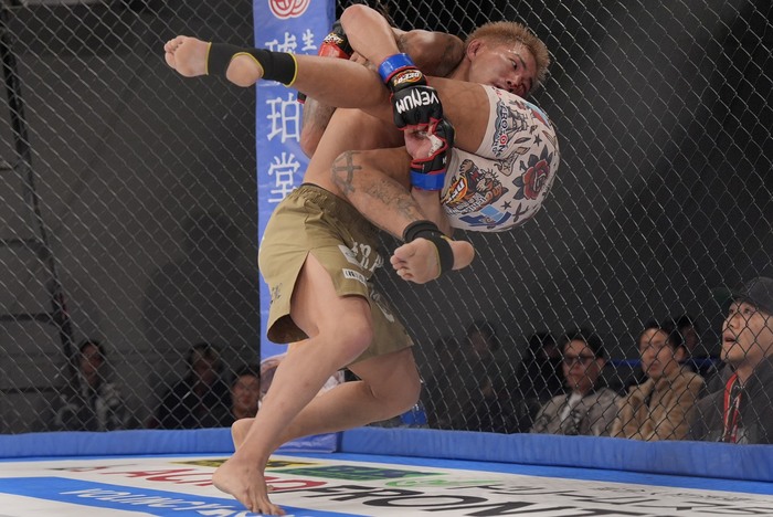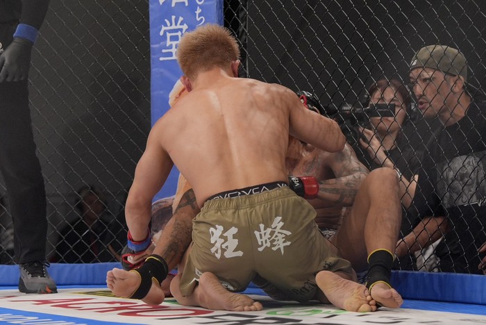 四つから体を入れ替えようとするナカムラに、戻した武が右で座して押し込み。さらに左差しに変えて押し込み右でパンチ。右ヒジ、ヒザを狙うナカムラに、ヒザを蹴り返した武。ローブローに。「減点1」。再開。中村は左から右、さらに右足を下から蹴り上げ。ローブローに。中断。ナカムラに「警告」で再開。