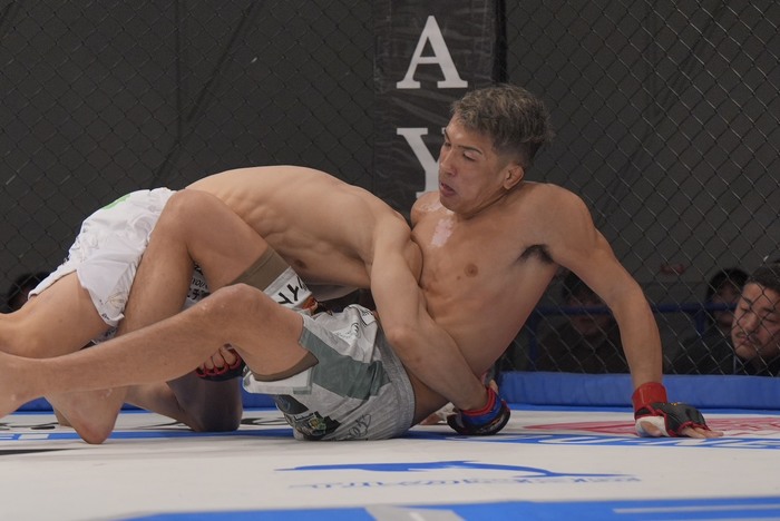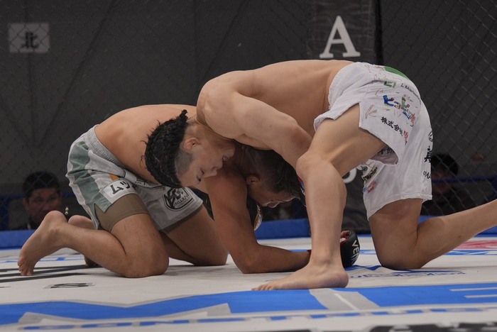 シングルレッグで崩す山﨑。立って突き放すウラケンはワンツーで前に。山﨑の組みを切るがパンチ一辺倒に。右ローのウラケン。山﨑の左右は手打ちに。壁まで押し込むがのど輪で突き放したウラケンはヒザが入るタイミングだが。右を当てたウラケンは右アッパー! 山﨑は組んでケージまでドライブして崩して尻を着かせてゴング。