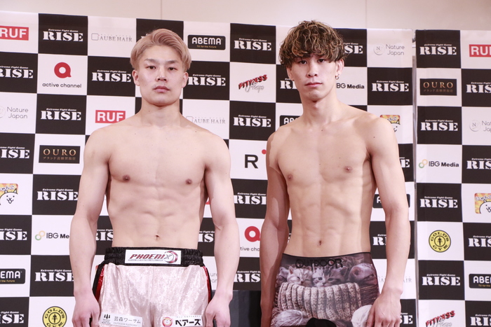 第9試合のスーパーライト級(-65kg)3分3R延長1Rで対戦する、同級2位・麻火佑太郎(PHOENIX)は64.95kg、同級7位・木村“ケルベロス”颯太(心将塾)は64.85kgでそれぞれ計量をパス。