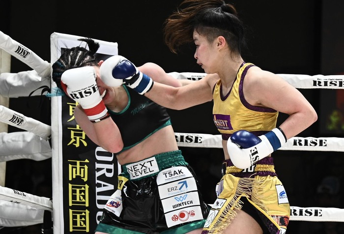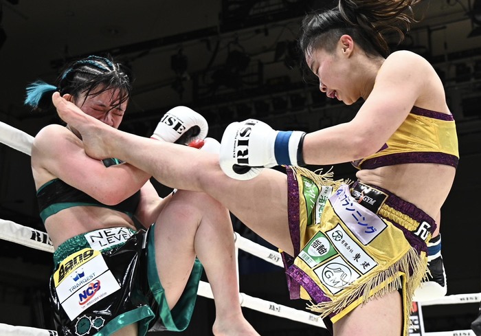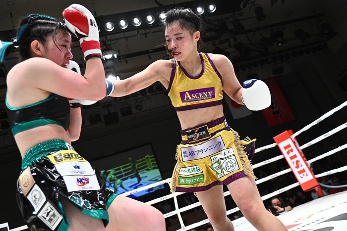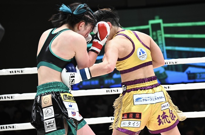 奥村の右ローがタイミングよくヒットし、続く左フックも。まりもの右ローには左ボディを返す。まりもは思い切り左右フックを振るが、奥村が左ボディ、右ロー、さらに左ボディで畳みかけてまりもを下がらせる。