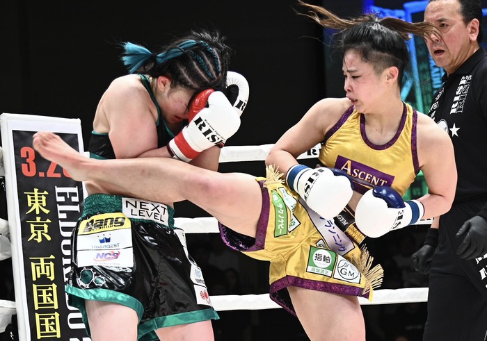 3Rが始まると同時に打ち合う両者だが、奥村の左ボディが強烈にヒットし、まりもは下がる。それでも必死にパンチを出して反撃するまりも。声を上げながら攻撃を出すまりもに、奥村のヒザが突き刺さる。さらに左右ボディ、前蹴り。コーナーに詰まるまりもへ容赦ない奥村のパンチと蹴り。まりもは右フックを返すも、その直後に奥村が右ハイ。奥村が後ろ蹴りを放って試合終了。