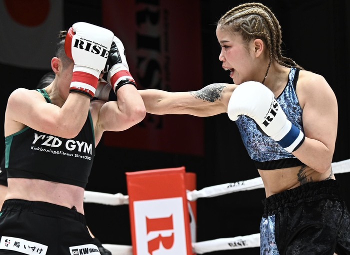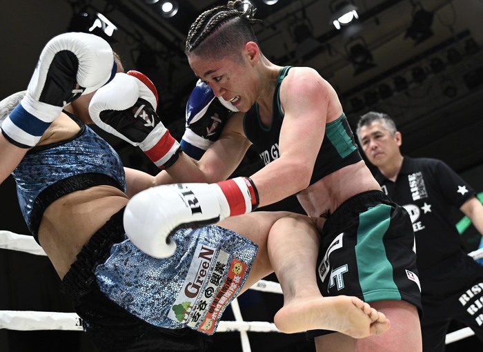 ヒザ蹴りを出した奥村に毬那の右フックがヒット。蹴り数が多かったのは奥村だが、毬那も前進とパンチのヒットがどう評価されるか。