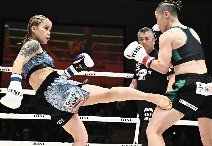 1R、お互いの距離が遠い中、ロー、ミドルを出し合う。奥村はサイドキックも出し、右ミドル、右ローを当てていく。毬那は右カーフ。パンチはほとんどなく、蹴り合いに終始。