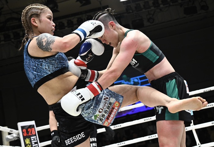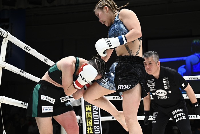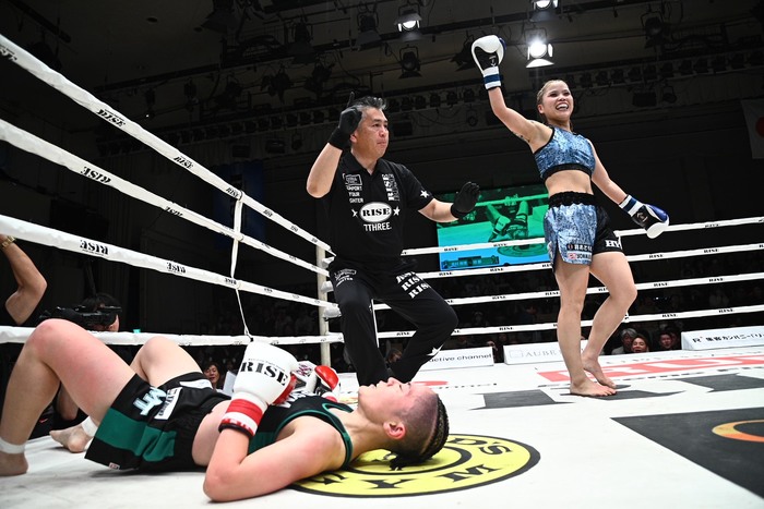 攻守が一気に逆転、奥村が攻めていき右ロー、右ヒザ、右ミドルの連打。ロープ際で浴びる毬那は悶絶しながら倒れ、奥村のKO勝ちとなった。