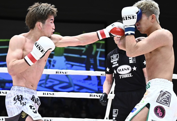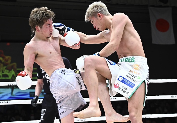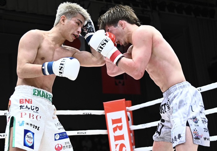 3R始まってすぐにバッティング。すぐ再開となり、大森がワンツーの連打で前へ出ていく。梅井も負けじとワンツー。打ち合いで梅井の左フックがヒット。大森も右アッパーを返してヒザ、梅井もすぐにヒザを蹴る。