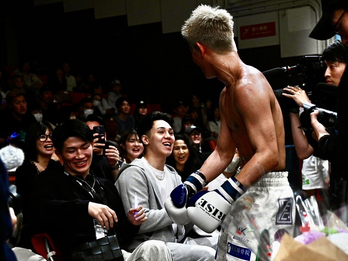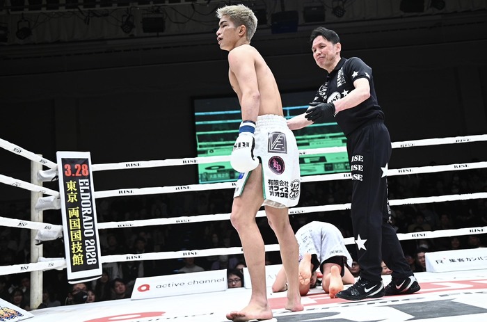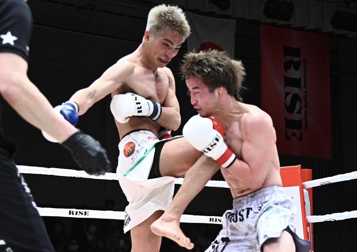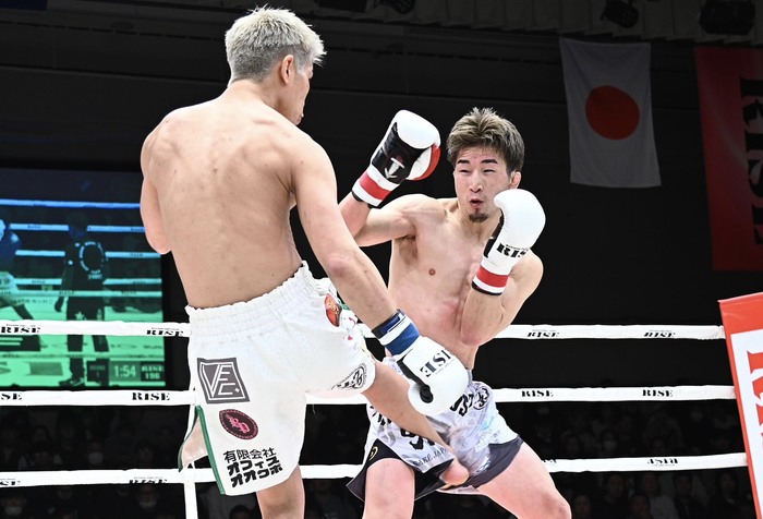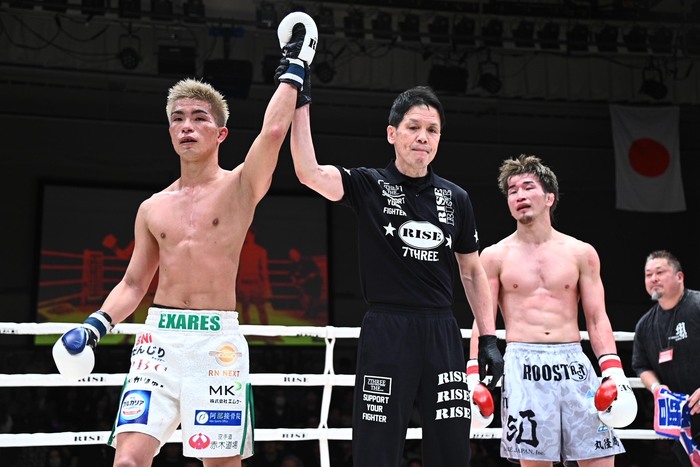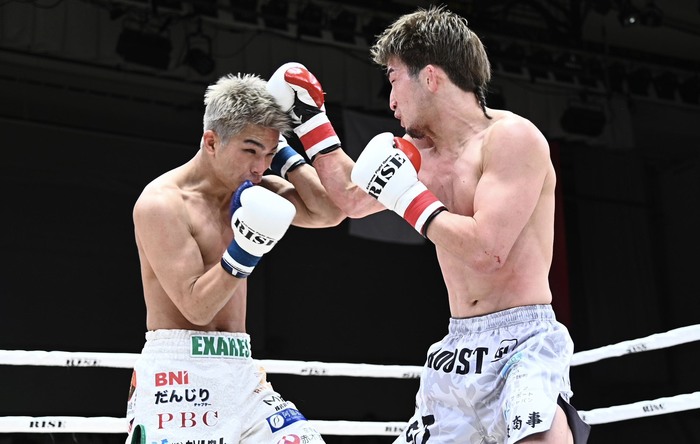 大森がガムシャラに前へ出て連打とヒザ、梅井も左右フックを返す乱戦に。梅井は右フックと左アッパー、大森が左フックとヒザ。大森の右がヒットし、梅井が下がったところで試合終了。
