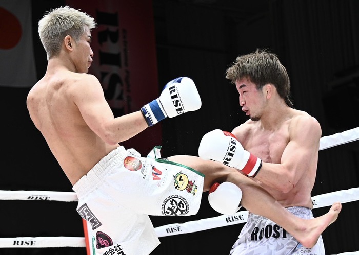 インターバルがとられ、試合再開。梅井のヒザに右インローを返す大森。梅井はジャブから左ミドル、大森がパンチを出して来ると左ストレートで迎え撃つ。