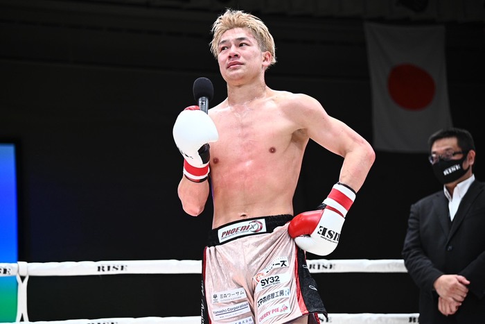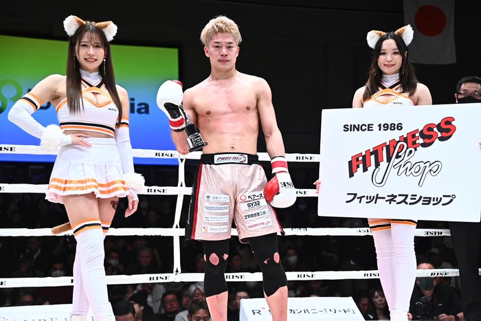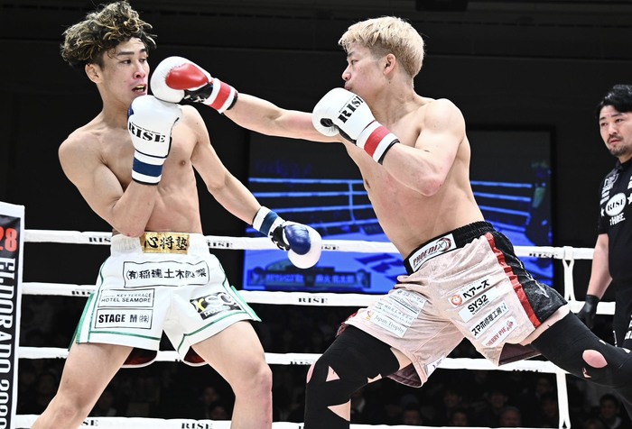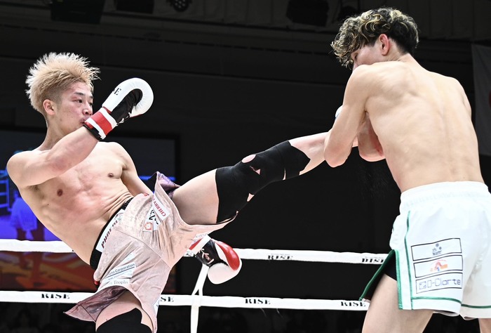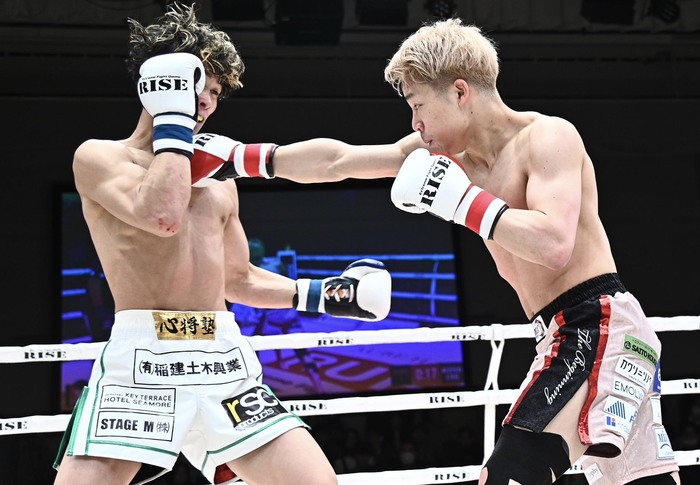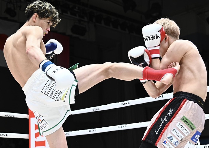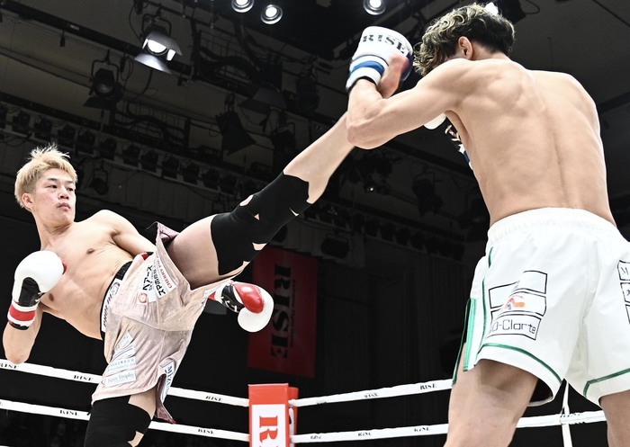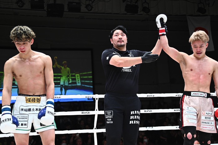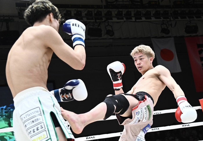 麻火の左三日月には木村が左ボディを返し、お返しの右三日月。麻火の右カーフに木村が右カーフを返すと麻火がバランスを崩し、木村は足を指差す。1Rが終わると木村はガッツポーズ。