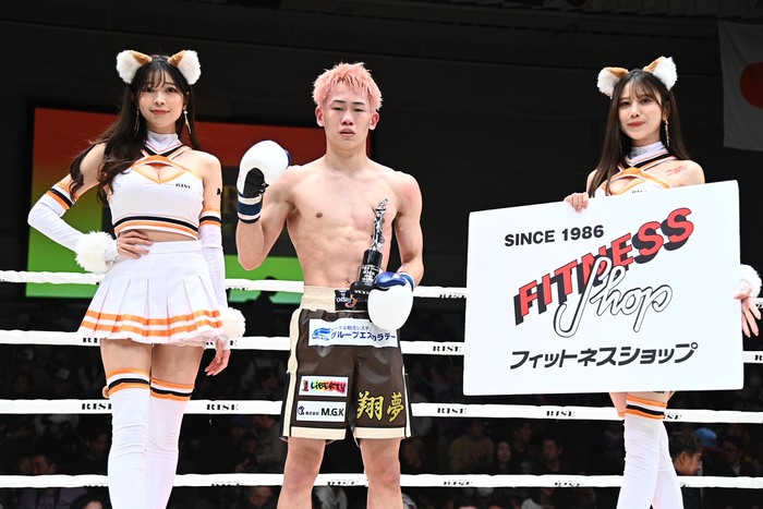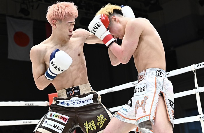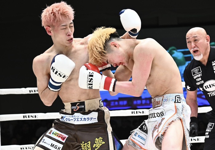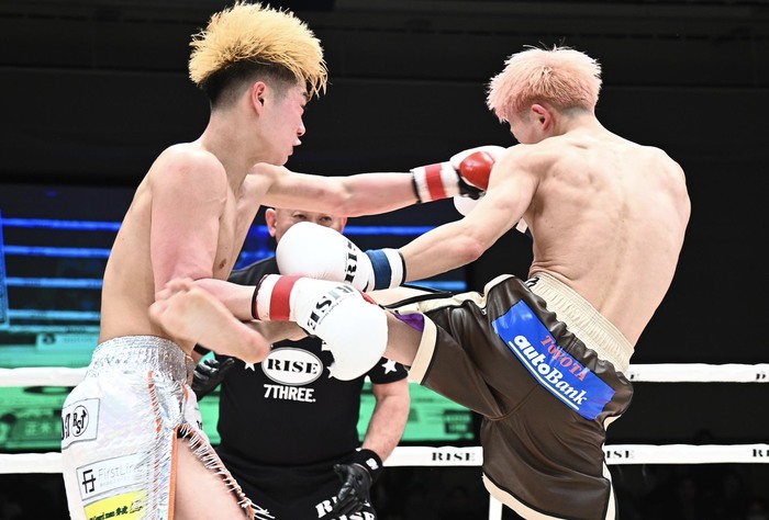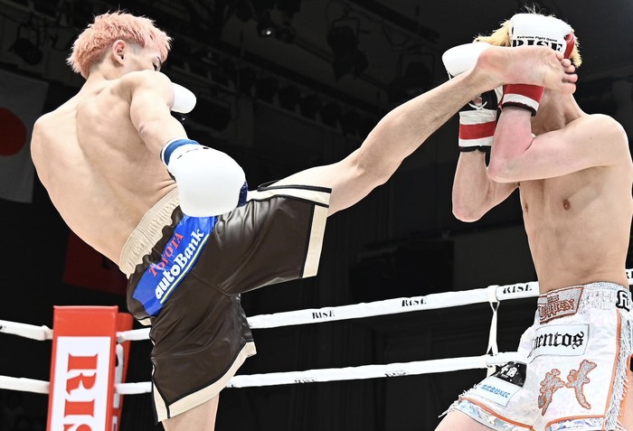 1R、矢沢永吉の曲で入場した水野はサウスポーで、髪型や立ち姿が昔の那須川天心にそっくり。