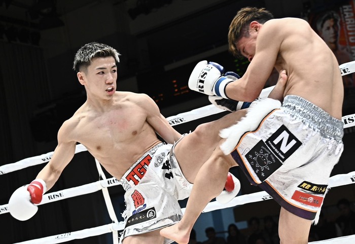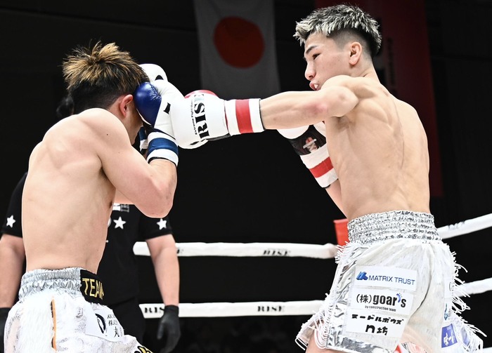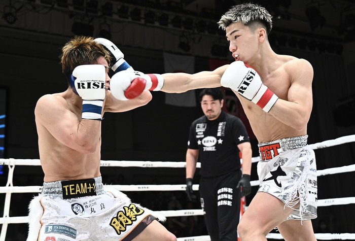1R、小野は自分の距離をしっかりととり、右ストレート、左ボディ、右ローを当てていく。前に出る内山はジャブ、右カーフを蹴るが距離を詰めたところで小野が先手を取る。右ストレートから一気に前へ出た小野は左右連打でダウンを奪う。再びのラッシュで左フックによる2度目のダウンを追加。