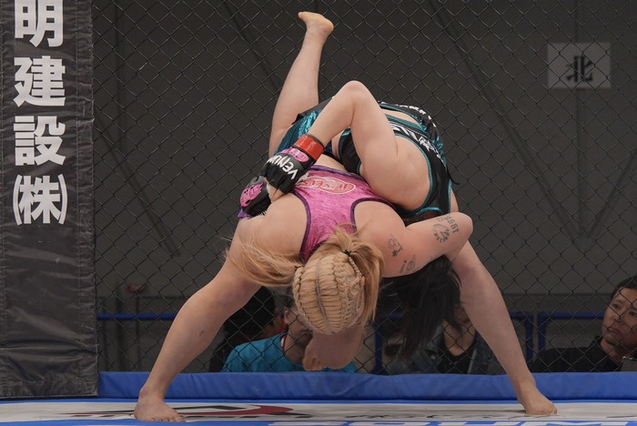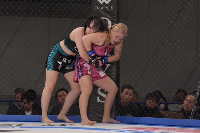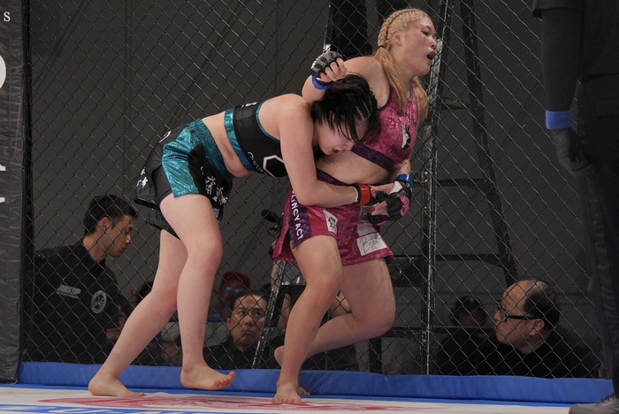 右ストレート、左フックの樹季に百湖は体を入れ替え、左右フックの樹季をかわした百湖。ワンツーの右を当てる。樹季も左を返すと前に。シングルレッグの百湖に樹季はアームロック狙い。それを防いでシングルレッグテイクダウンの百湖。