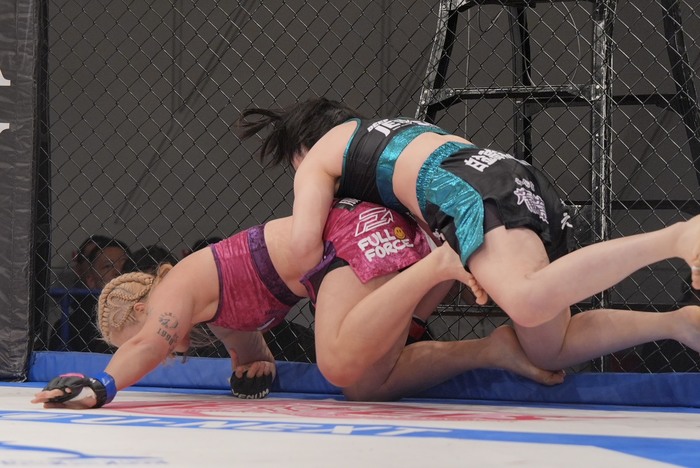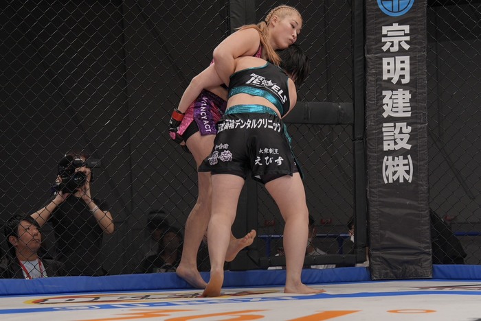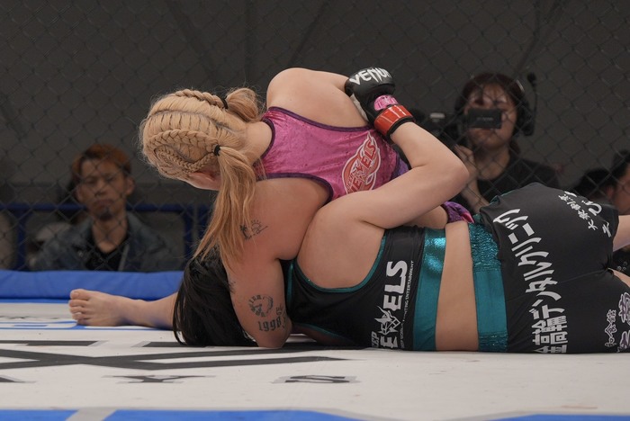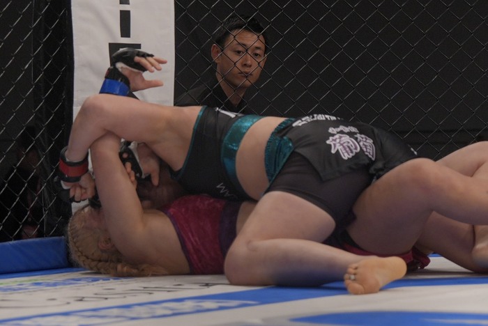 引き手を取ろうとする樹季に獲らせず横について足払いテイクダウンの百湖! ハーフガードの樹季に左で腰抱き、右のパウンドを連打! 動けない樹季を見て、レフェリーが間に入った。