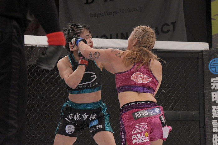 下から蹴り上げの樹季をかわしてサイドを奪い、左のパウンド連打! ゴング。樹季は立ち上がるのに時間がかかる。