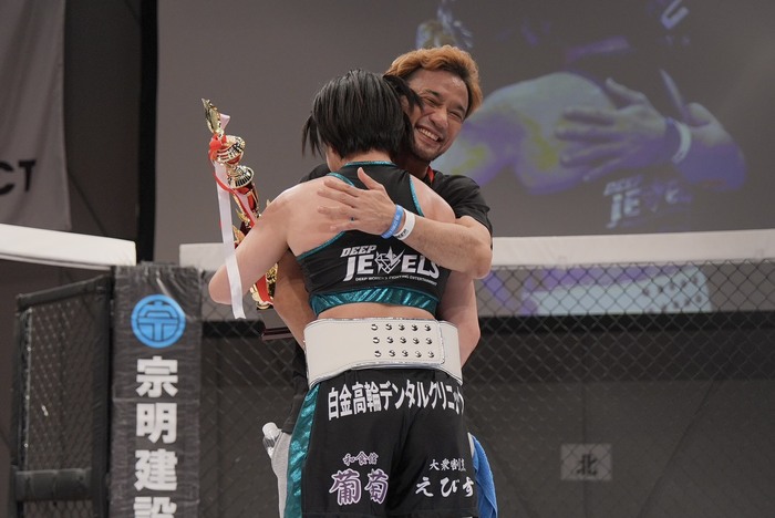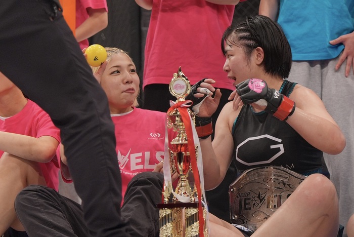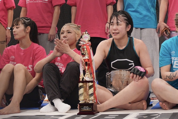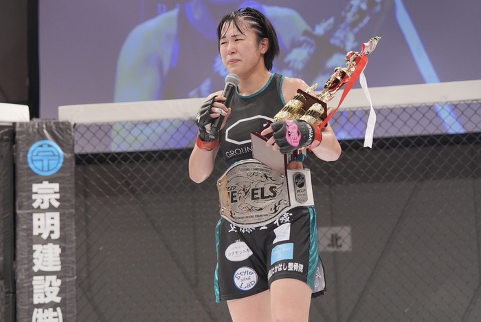 DEEP JEWELSバンタム級のベルトを巻いた百湖は、「去年とんでもない怪我をして、もう2度とここに戻れないかもしれないと思いました。めっちゃキツい練習をして、ジムの仲間、家族のおかげでこうしてベルトを巻くことができました。もっと大きな舞台でもっと強い選手と戦いたいと思います」と語った。