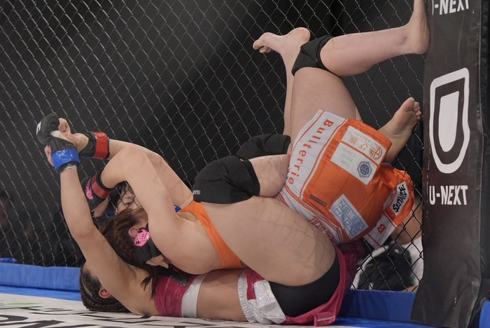 首を解いて立ち上がろうとしたちゃんりなに右で差して崩すあきぴが背中を着かせてパウンド。マウントを奪いパウンドも、ヒザを間に入れたちゃんりな。あきぴは中腰からパウンドでゴング。