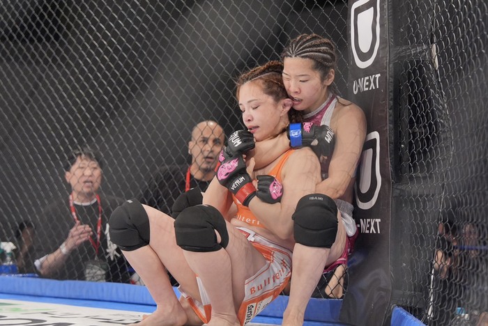 2R、打撃の間合いを作らせないあきぴは首相撲ヒザ。体を入れ替えたちゃんりなに両脇差してヒザ、シングルレッグのあきぴ。首に手を回したちゃんりなはバックに引き込み。背後にパンチするあきぴに、ちゃんりなはバックから絞めも、あきぴはケージウォークで腰をずらしてトップに。