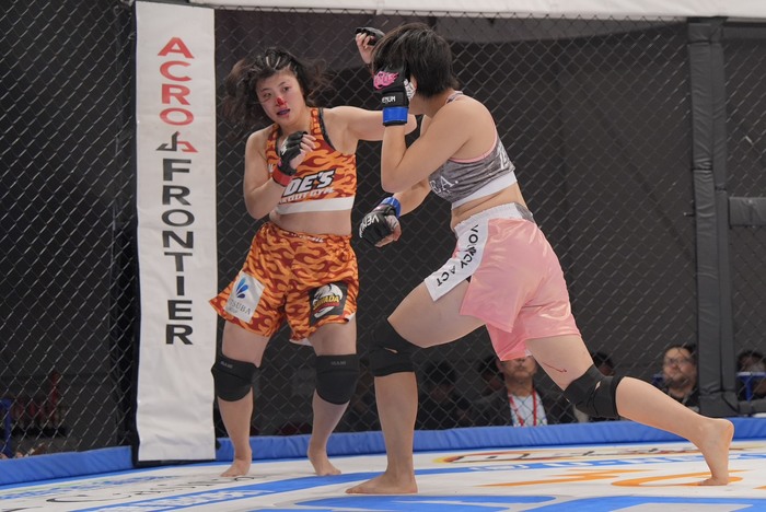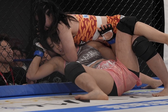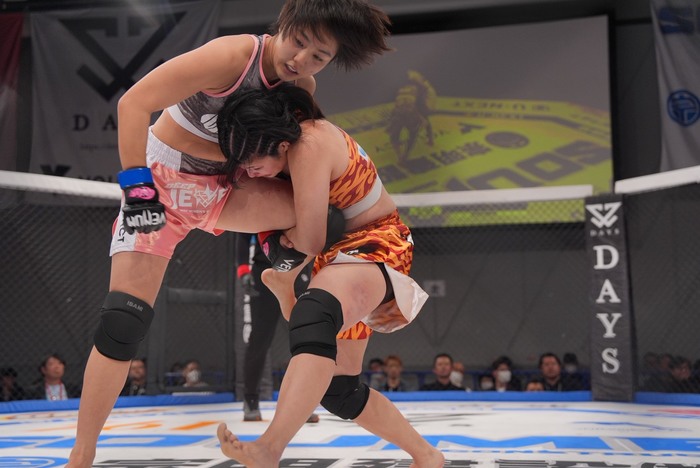 組んだ倒すたからに、2R 田川がヒザを効かせて左右ラッシュ。