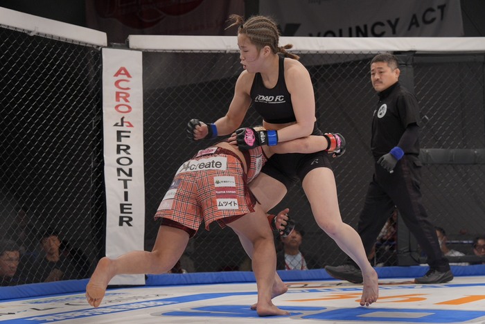 1R、オーソのキム・ダンビは右ストレートで前に。インローを突く万智は右アッパー、左フックからシングルレッグテイクダウン。