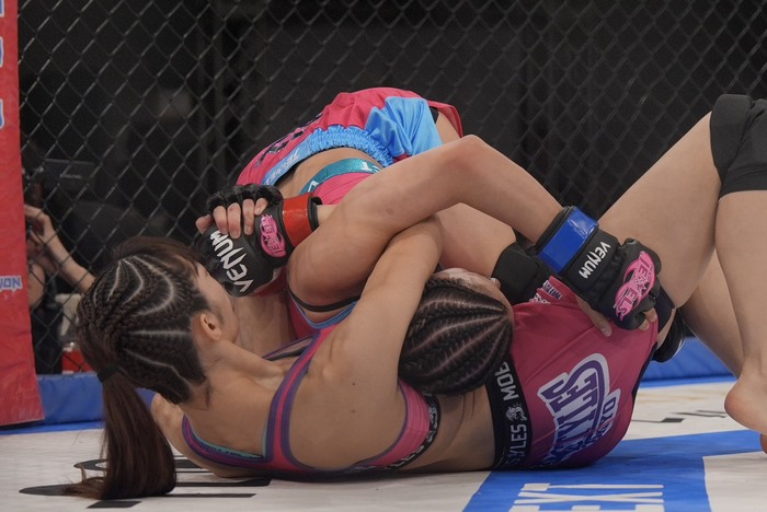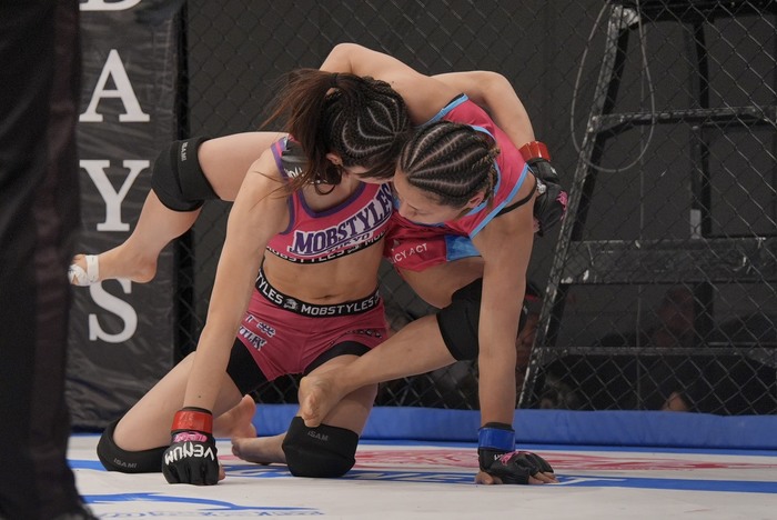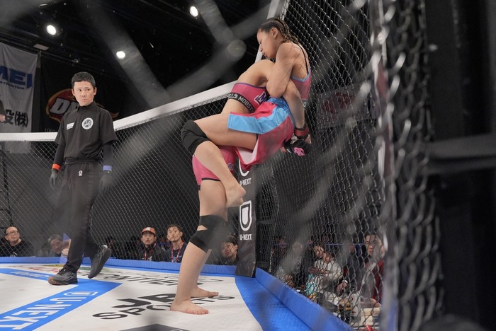 そのままケージに押し込み、いったん離れて右を突くが、そこに村井がダブルレッグテイクダウン。スプロールできなかった山吹はネルソンでスイープ狙いもゴング。