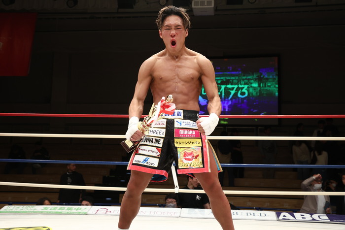 上遠野寧吾=Krushフライ級トーナメントで3試合を制しKrushフライ級王者を戴冠。戦績は10戦未満ながら、無敗でのタイトル獲得となった。