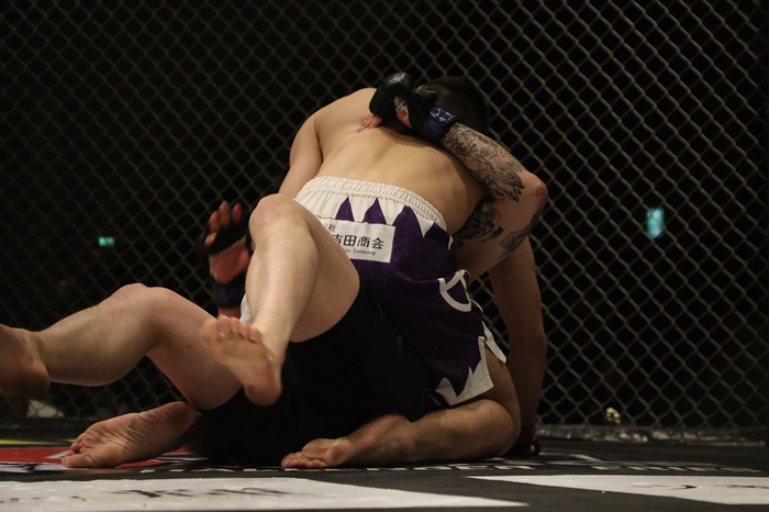 左ストレートを伸ばしてケージに詰めて右で差して押し込んだヅッキーニョスはダブルレッグテイクダウン。ケージ背に座るクォン・ヨンビンの足を手繰っての立ち上がりに右腕でギロチンチョークを合わせたヅッキーニョスは左足をかぶせて、そのまま返してトップ、マウントで絞る。