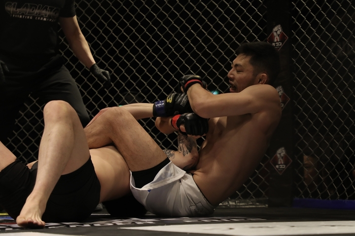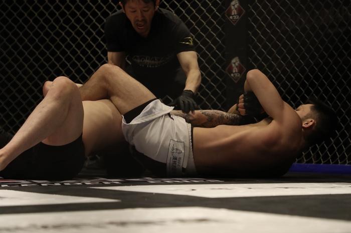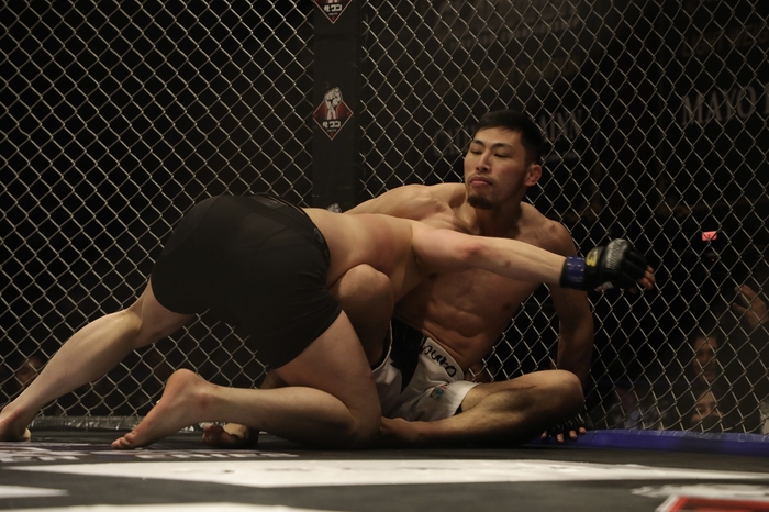 クラッチするクォン・ヨンビンに、落ち着いていったん左足をすくいつつ、クラッチした両手ごと引き付けて左腕を伸ばして極めた。