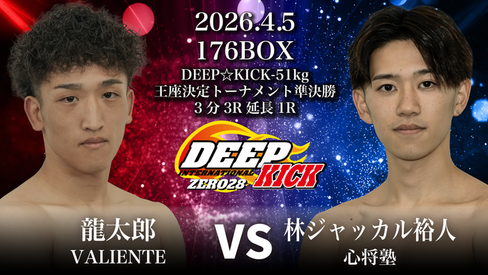 昨年9月にDEEP☆KICK-51kg第5代王者に輝いた松本愛斗(月心会チーム侍)がベルトを返上したため、同級1位の龍太郎(VALIENTE)vs.同級4位の林ジャッカル裕人(心将塾)、現在プロ負けなしを誇る佐々木昊生(B.F.A-SEED)vs.同級3位の泰生(NJKF誠輪ジム)の4名。佐々木・林・泰生の3人は昨年の3月・4月・5月にプロデビューという期待のルーキーが多く集まるトーナメントとなった。