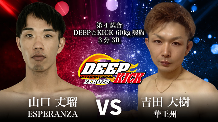 第1部『DEEP☆KICK ZERO 28』では他に、DEEP☆KICK-60kg契約にて2月『Krush.185 ~in OSAKA~』に出場を果たすも判定負け、ここで復帰を飾りたい山口丈瑠(ESPERANZA) と、勝利は全てKO勝利というハードパンチャーな36歳・吉田大樹(華王州)。