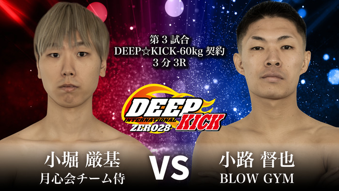 DEEP☆KICK-60kg契約にて昨年11月に久方ぶりの出場もドロー、今度こそという気持ちが強いだろう小堀厳基(月心会チーム侍)vs.こちらも11月に苦渋を飲まされ次こそはと勝利を狙う小路督也(BLOW GYM)。
