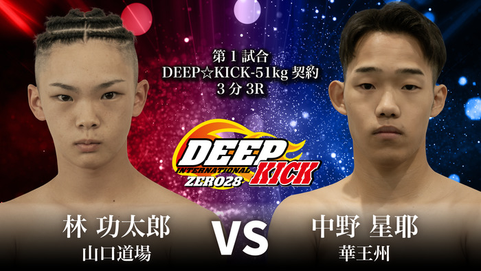 DEEP☆KICK-51kg契約にてプロデビューから2連勝もその後2連敗、ここで勝利を掴み再び勢いに乗りたい林功太郎(山口道場)vs.激戦は見せるもここまで1敗1分とプロ初勝利に飢える中野星耶(華王州)の4戦が発表された。