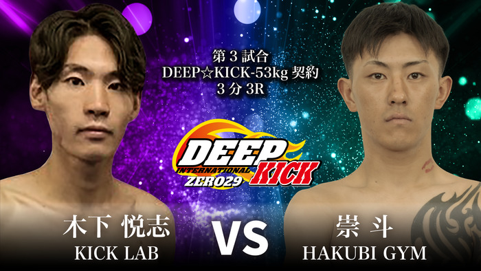 DEEP☆KICK-53kg契約にてKPKB・修斗・ACCEL・HOOST CUPなど様々な団体で活躍している木下悦志(KICK LAB)vs.香川県から全国に名が轟く選手を目指し27歳でプロデビューを果たした鉄の心を持つ崇斗(HAKUBI GYM)。