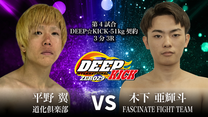 DEEP☆KICK-51kg契約にて昨年7月にプロ復帰を果たし4カ月で3戦をも戦い抜いた驚異の40歳・平野翼(道化倶楽部)vs.鋭いパンチを軸にアグレッシブな攻勢が魅力の木下亜輝斗(FASCINATE FIGHT TEAM)。