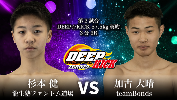 DEEP☆KICK-57.5kg契約にて先日2月14日の『SHOOT BOXING 2026 act.1』でも1R TKO勝利で現在3戦3勝3KOとパーフェクトレコード継続中の杉本健(龍生塾ファントム道場)vs.昨年12月にプロ初勝利を2RKOで飾り、勢いのままに2連勝を狙う加古大晴(teamBonds)。