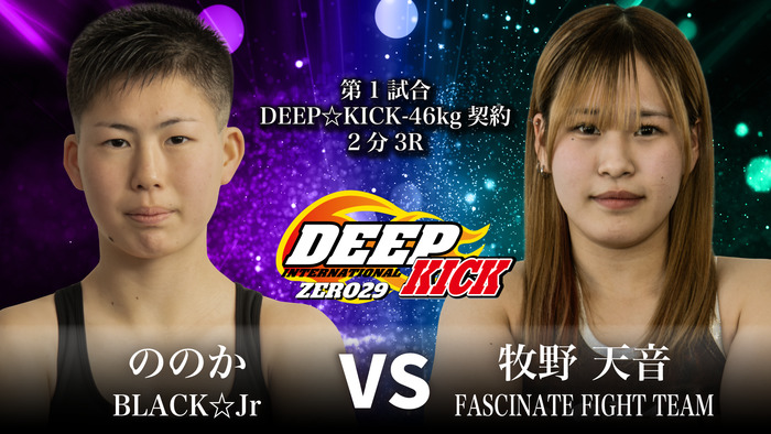 DEEP☆KICK-46kg契約の女子ワンマッチにて今回がプロデビュー戦となるののか(BLACK☆Jr)vs.プロデビュー戦で勝利し続けざまに2勝目を狙う牧野天音(FASCINATE FIGHT TEAM)の5試合が発表された。