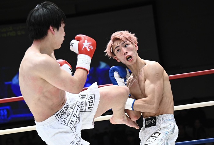 1R、内田は小さくステップを踏みながらジャブと左ミドル。藤田は右カーフを蹴っていく。藤田は左ミドルを蹴ると、右フックから左右フックの連打で内田をコーナーへ詰めた。