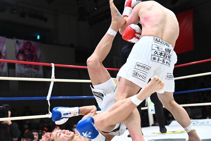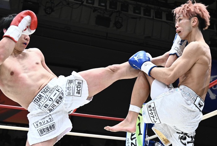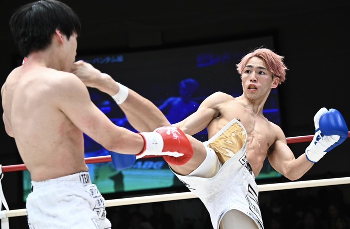 内田は前蹴りで藤田を離すが、藤田のボディを明らかに嫌がり身体を丸める。藤田が左右フックで打ち合いに行くと、内田は胴廻し回転蹴り。前に来る藤田に内田が右ハイを放つと、藤田の蹴りがローブローとなってしまった。