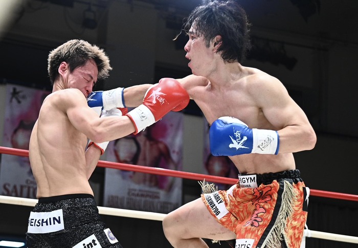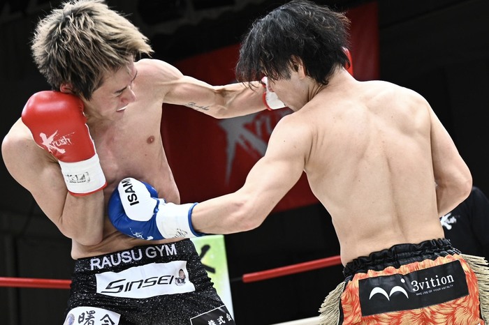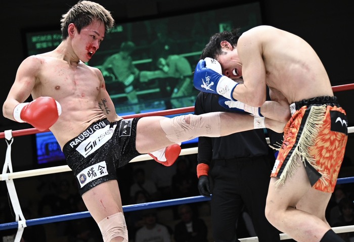 3R、愛瑠斗の左フックに左フックを合わせる嶋。愛瑠斗はパンチからローでで攻めて攻勢になるも、嶋が左右フックを当て返してくる。鼻血を出す愛瑠斗は嶋をコーナーへ詰めての連打。ボディへのヒザからさらに連打、左ボディ。愛瑠斗は左三日月と右カーフ、左右フック、ヒザで嶋をロープへ釘付けにしてほぼ一方的に攻めるが、嶋はガードを固めて耐えた。