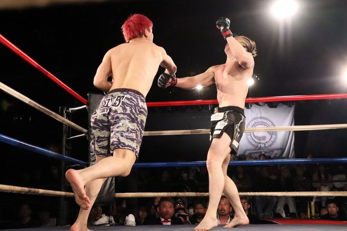 2R、たておにドクターチェック。再開。前に出るたてお、青井は右回りでさばいて、たておの入り際に右アッパーを突く。左フックの青井を追うたておに少し背を向けて誘い込んでまたもバックフィスト!