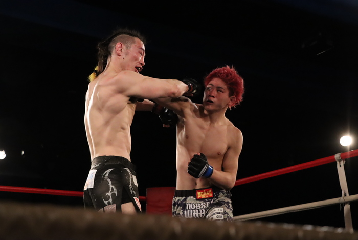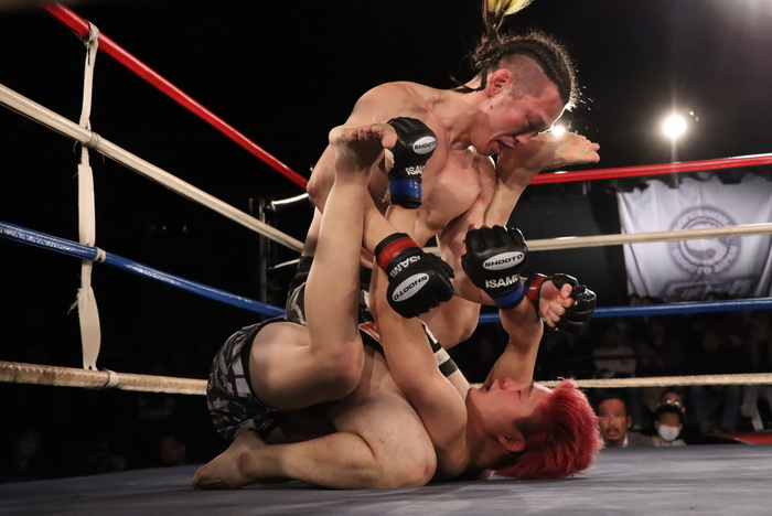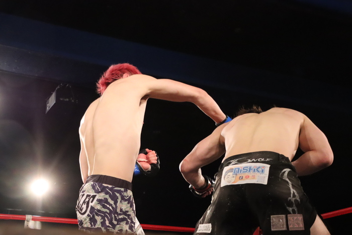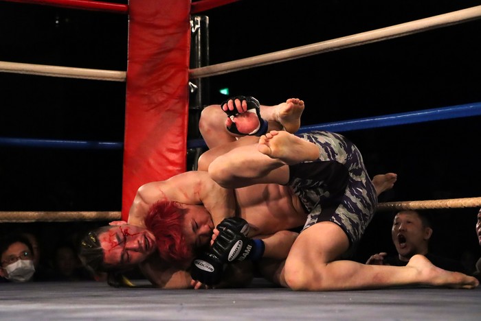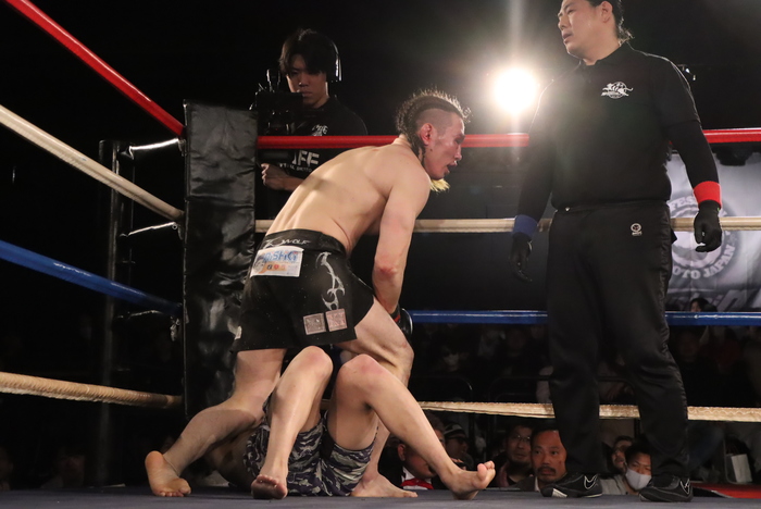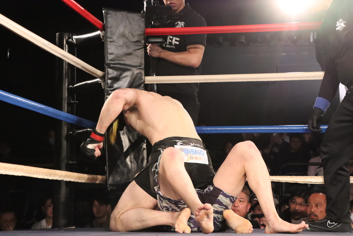 たておの入りに右アッパーを突き上げた青井だが、もらいながら組みつき、コーナーでバックについて引いて倒したたておがバックマウントからパウンドでゴング。